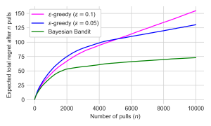 However, it eventually accumulates more regret than the ε-greedy policy with a lower ε, which is able to more aggressively exploit the best bandit once it has finally learned it. Both of these policies accumulate 60%+ more regret than the Bayesian Bandit, which both learns the best bandit more quickly and also exploits it more dramatically once it is learned. Essentially, the Bayesian Bandit adaptively adjusts its handling of the exploration vs exploitation issue, while the ε-greedy policies are hard-coded to explore less than they should initially and to continue exploring long after it is needed.