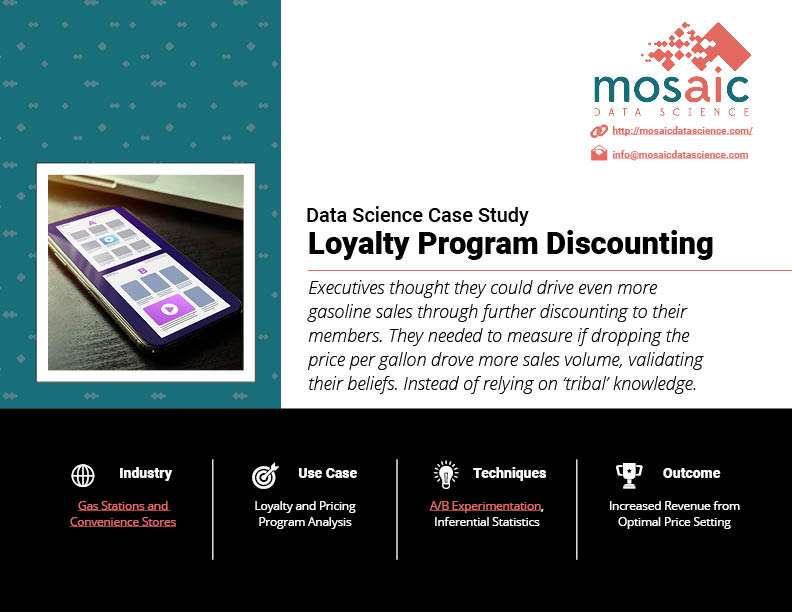 A leading operator of quick service convenience stores & gas stations across North America sought Mosaic out to provide insights around their loyalty program. The firm manages a loyalty program through a mobile app to drive brand loyalty with customers and to increase the volume of goods sold. Executives thought they could drive even more gasoline sales through further discounting to their members. They needed to measure if dropping the price per gallon drove more sales volume, validating their beliefs. Instead of relying on ‘tribal’ knowledge, the company reached out to Mosaic to take a data driven approach on loyalty program analytics.